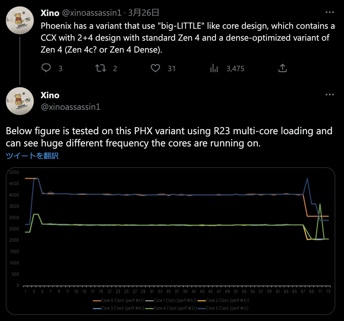 @xinoassasin1氏によると、Phoenix 2のES品を用いてCinebench R23でベンチマークを行った時の動作クロックが掲載されています。