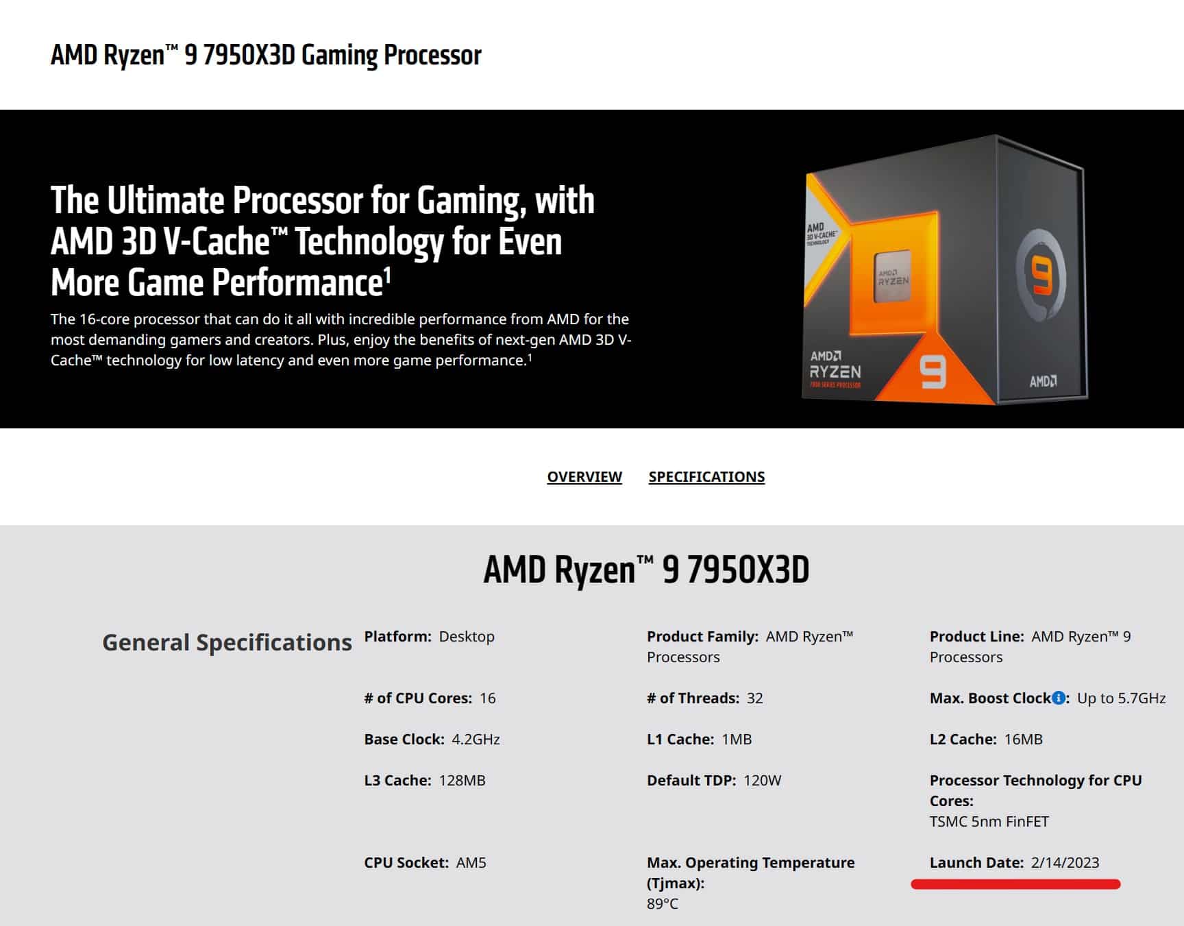 Ryzen 7000X3Dシリーズ各モデルの仕様が掲載されているサイトには、Launch Dateつまり発売日が2023年2月14日(バレンタインデー)に発売される事が明らかにされています。