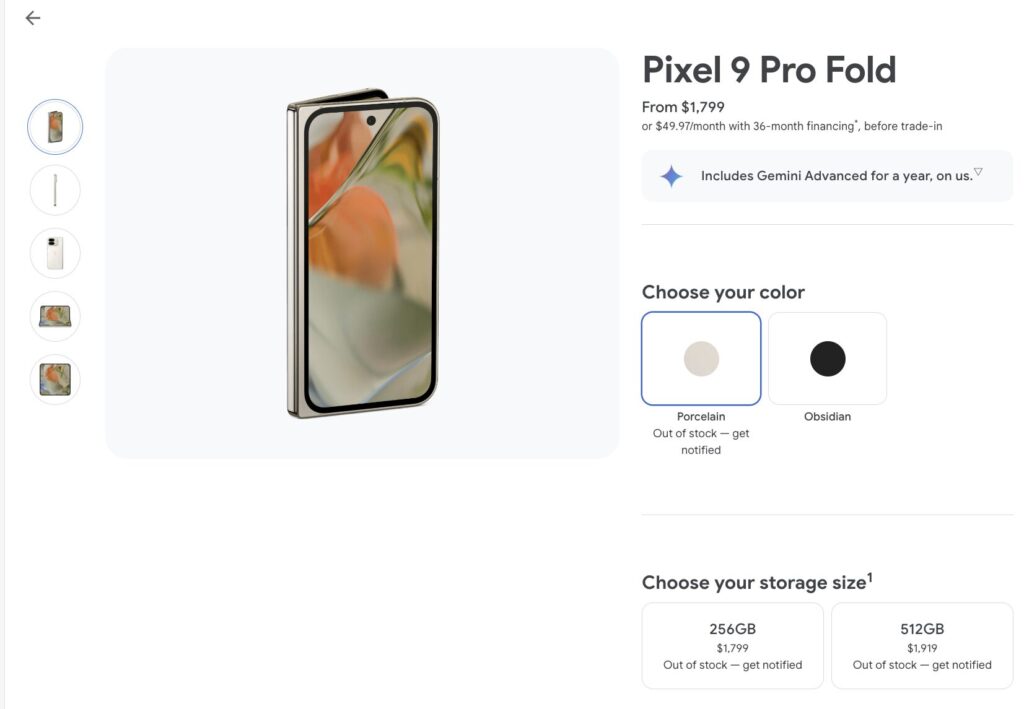 Google Pixel 9 Pro Foldは海外では256GBモデルが$1799、512GBモデルが$1919と非常に高価なスマートフォンになっていますが、予約開始がされた8月14日からたった1日でアメリカのGoogle StoreではPorcelainカラーすべてのモデルが売り切れ、Obsidianもそのあと間もなく在庫なし状態になっているとのことです。