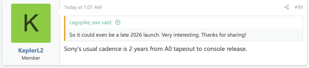 なお、このUDNAを搭載したPS6向けチップセットは2025年終わりごろに最初の試作チップであるA0品がテープアウトされるとのことですが、過去何度もソニーはA0チップのテープアウトから2年後にハードウェアを発売するスケジュールを維持していることをKepler_L2氏は明らかにしています。そのため、PS6に関しては2027年秋ごろに登場する可能性が高いと言えそうです。