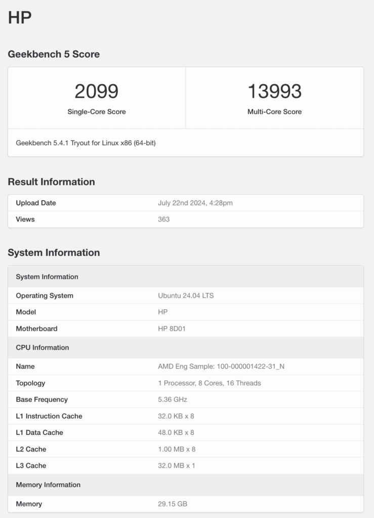 この高性能APUであるStrix Haloのベンチマークは、Geekbench 5のデータベースに登録されており、HP製ノートPCにLinuxを搭載した状態で計測が行われました。
