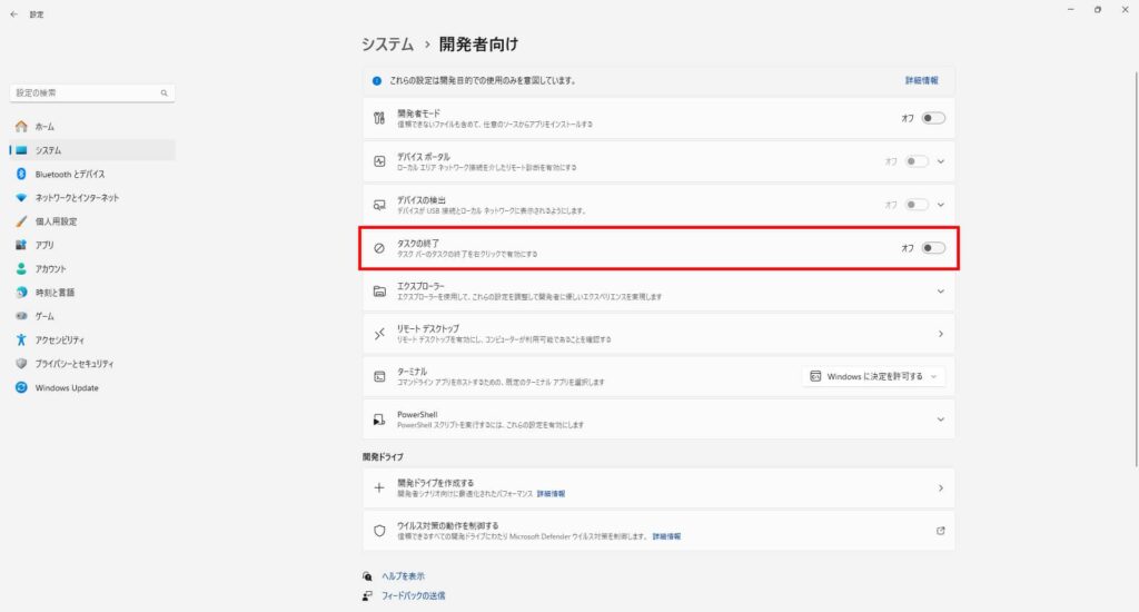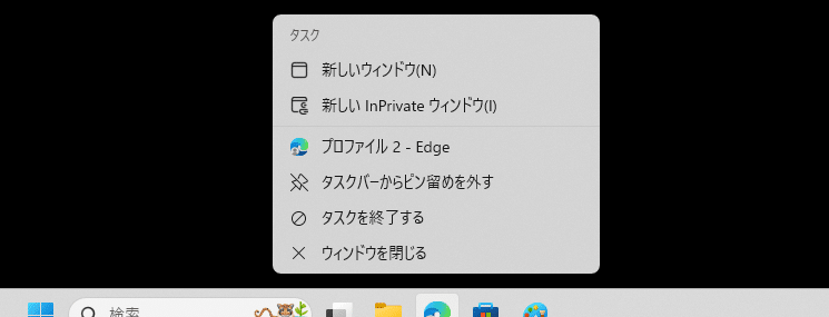 この設定を有効にすると、タスクバーから起動中のアプリを右クリックした際に「ウィンドウを閉じる」の上に「タスクを終了する」ボタンが表示されます。このボタンを押すことで、タスクを即座に強制終了することができます。