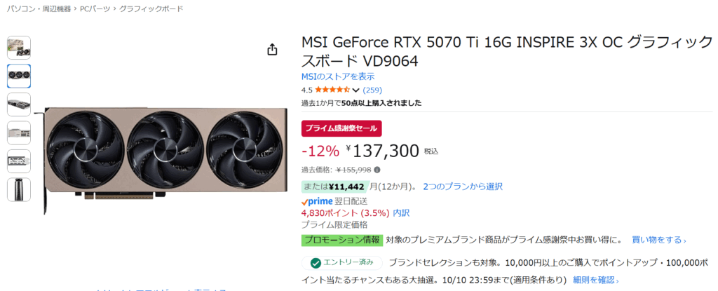 特に注目なのがMSI製「GeForce RTX 5070 Ti 16G INSPIRE 3X OC」です。セール価格は137,300円ですが、最大8,263ポイントの還元を受けることで、実質129,037円での購入が可能になっています。