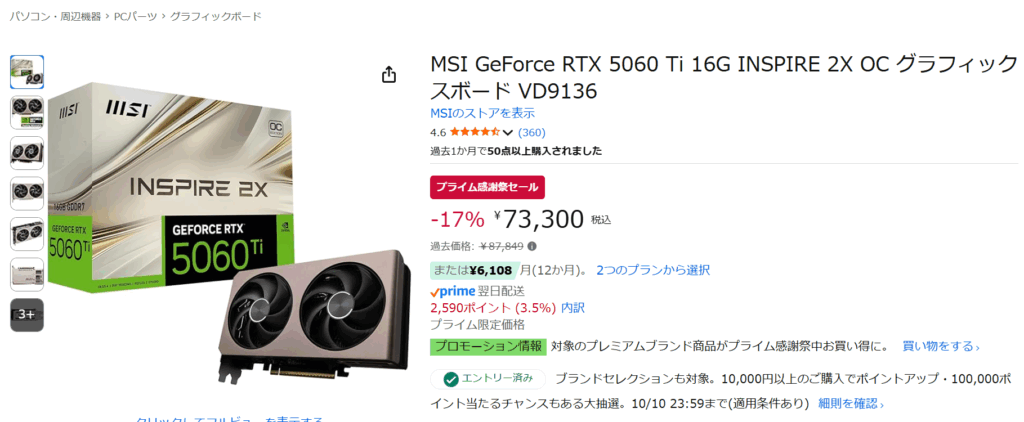 ミドルレンジモデルのGeForce RTX 5060 Tiの中で、16GBのVRAMを搭載する製品もセール対象です。MSI GeForce RTX 5060 Ti 16G INSPIRE 2X OCが73,300円で販売されています。