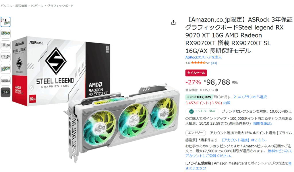 Radeon RX 9070 XTは3年保証付きで約9.3万円