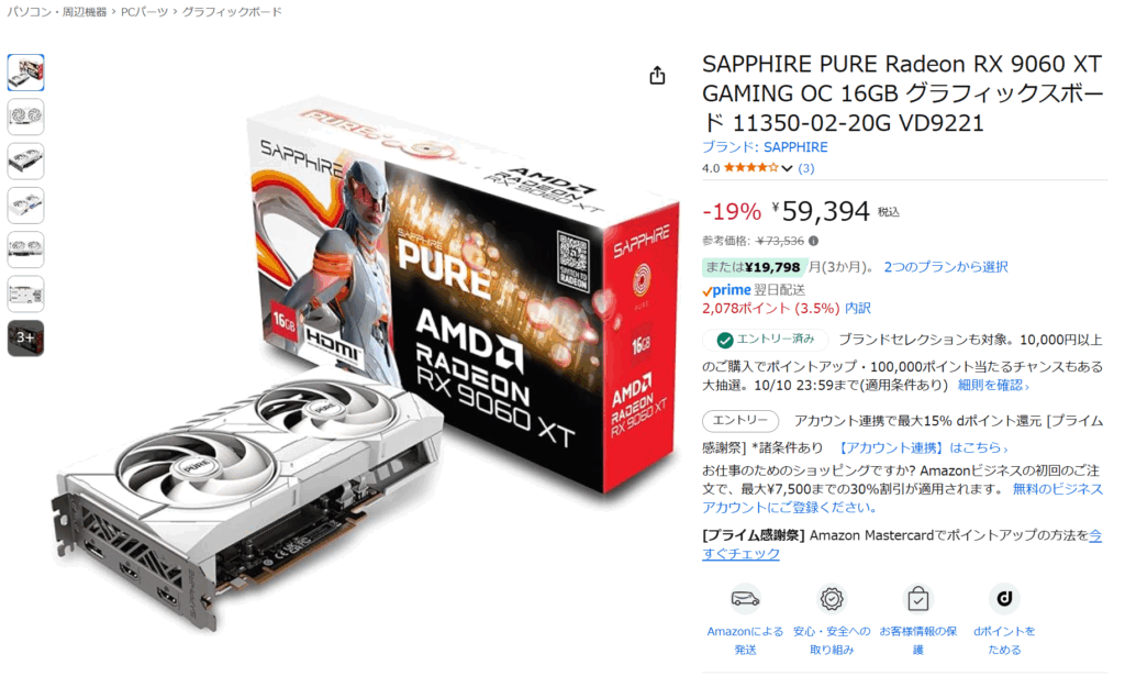 ミドルレンジ向けのRadeon RX 9060 XTの16GBモデルも、Sapphire製「Pure」シリーズのRadeon RX 9060 XT 16GBがセール中です。通常73,536円が59,394円に値下げして販売されています。