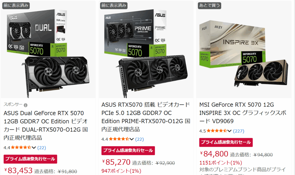 さらに、ポイントアップキャンペーンやAmazonマスターカードなどを持っている場合は5,101ポイント獲得できるため、これらをフル活用できればRTX 5070を78,352円とかなり安く手に入れることができます。