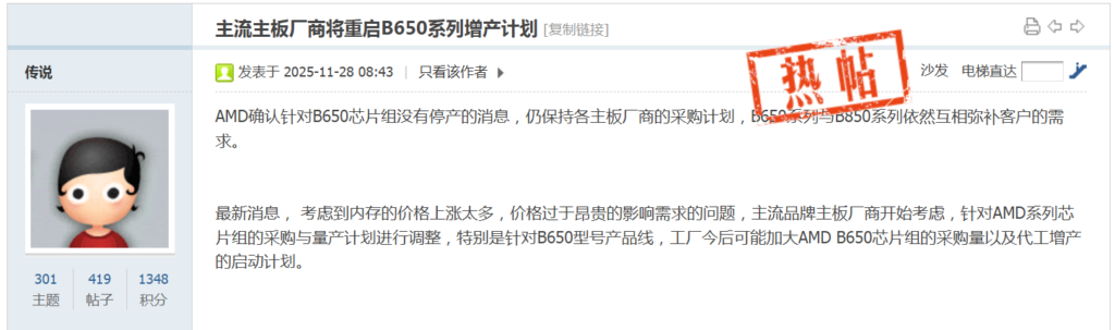 博板堂に掲載されたリークによると、AMDはB650チップセットの生産終了計画を撤回し、今後も供給を継続する方針を各マザーボードメーカーに伝えたとのことです。