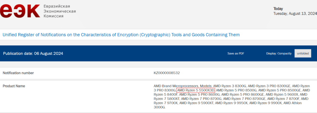 このデータベースに登録されたRyzen 5 5500X3Dは、2023年11月にRyzen 7 5700X3Dと共に仕様含めたリーク情報が登場していました。しかし、Ryzen 7 5700X3Dが2024年2月に発売された一方で、Ryzen 5 5500X3Dはその後、音沙汰がなく、投入が見送られたと考えられていました。しかし、今回ロシアやベラルーシ、アルメニアなどが加盟するユーラシア経済連合(EEC)の認証に登録されたことから、遅くても11月末にはRyzen 5 5500X3Dが発売される可能性があります。