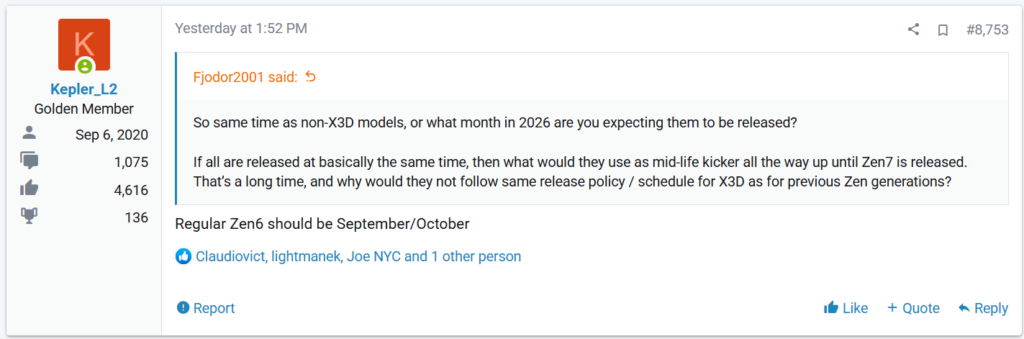 AMDのZen 6アーキテクチャを搭載する通常版Zen 6と、3D V-Cacheを搭載するZen 6 X3Dの2種類がコンシューマー向けに投入される予定です。リーカーのKepler_L2氏によると、通常版Zen 6は2026年9月から10月頃に発売される計画で進められているとのことです。