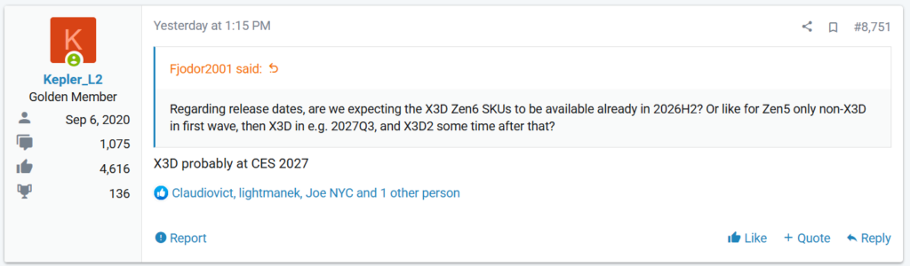 また、3D V-Cacheを搭載するZen 6 X3Dも現行世代と同様に後から登場するようです。その発表時期は2027年1月開催のCES 2027が予定されており、2027年1月から3月の間に発売される可能性が高いことも明らかにされています。