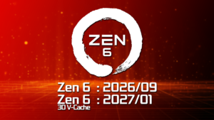 Zen 6世代のRyzenの発売時期は通常版が2026年9月から10月に発売される予定となっており、そのあと3D V-Cacheを搭載したZen 6 X3Dモデルが2027年1月開催のCES 2027で正式発表され、同年第一四半期中(1月から3月)の間に発売される計画になっています。