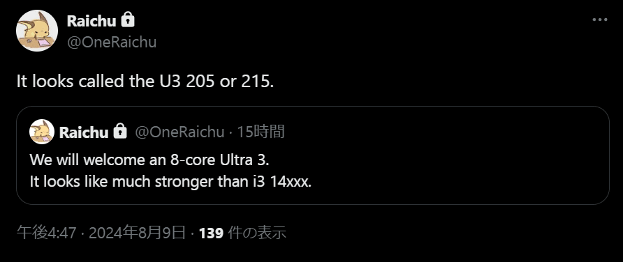 OneRaichu氏によると、Intelは8コア構成のCore Ultra 3の投入を計画しており、Core Ultra 3 205またはCore Ultra 3 215という名称で登場する見込みです。このCore Ultra 3は4P+4E構成になると見られ、現行のCore i3-14100の4P+0Eに対して、コア数が増えることが期待されています。