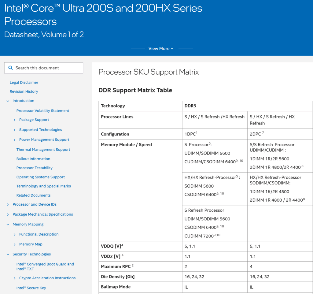 Intelのデータシートによると、現行のArrow Lake-S製品はCUDIMM(クロックドアンバッファードDIMM)の場合、最大6400MT/sまでの速度に対応しています。今回公開されたデータシートには新たにArrow Lake-S Refreshに関するスペックが追記されており、CUDIMMの場合は最大7200MT/sまでサポートすることが明らかにされています。