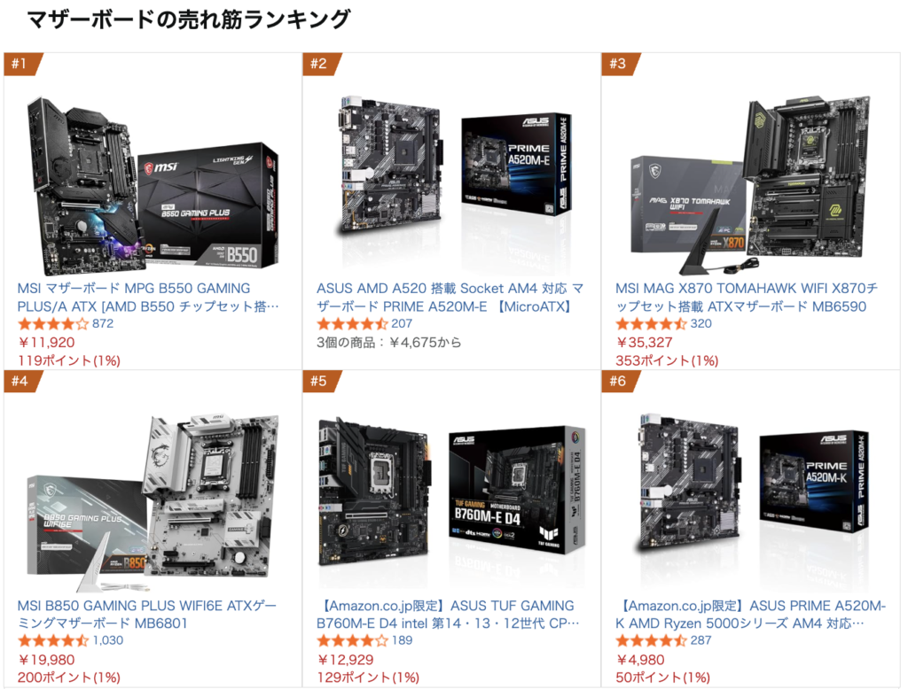 なお、AMDのB550とA520は、日本を含む世界各国で最近販売が好調です。2025年12月30日時点の日本Amazonにおけるマザーボード売れ筋ランキングでは、1位がB550、2位がA520マザーボードとなっています。また、IntelのB760Mについても5位にランクインしており、ASUSが増産予定のマザーボードは旧世代ながら異例の売れ行きを見せています。