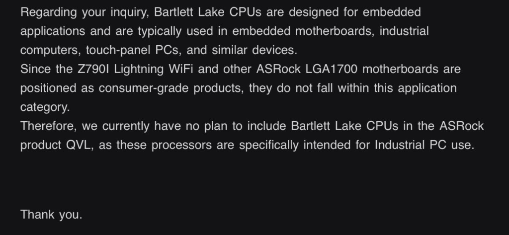 RedditでASRock製Z790マザーボードを使うユーザーが、ASRockに対してBartlett Lake CPUの対応可否についてメールで問い合わせを行いました。その結果、同CPUはLGA 1700に対応するものの、Z790などASRockが販売するLGA 1700マザーボードはコンシューマー向け製品であることから、組み込みPCなどエンタープライズ用途で使われるBartlett Lakeには対応する計画はない旨の回答がありました。