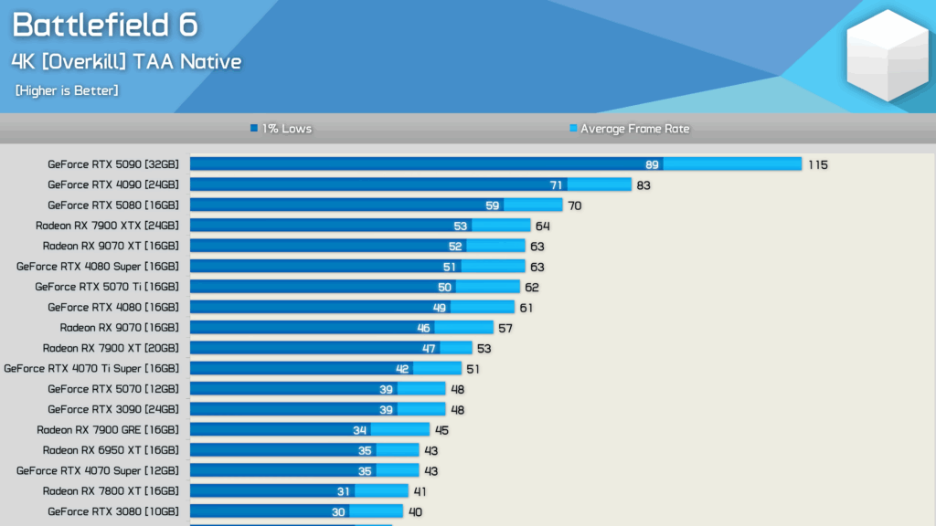4K解像度になると流石に負荷は高くなるようで、OverkillプリセットだとGeForce RTX 5090でも115fpsとなっています。また、RTX 5070 TiやRTX 4080がギリギリ60fpsを超えられるパフォーマンスです。