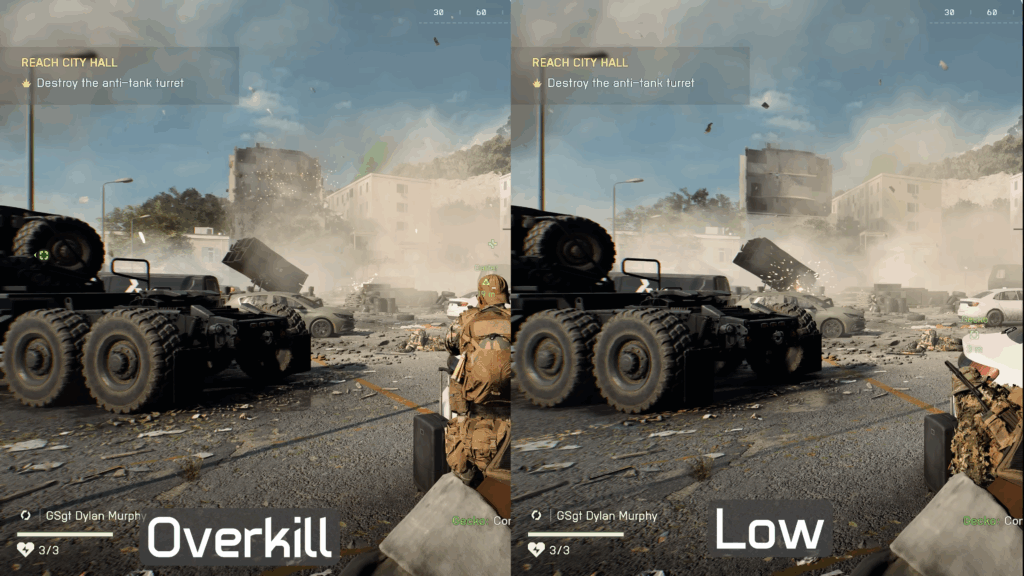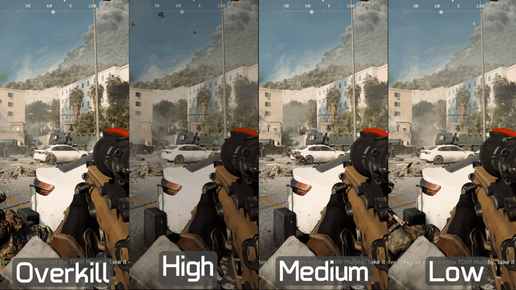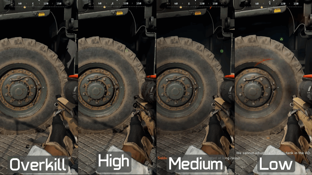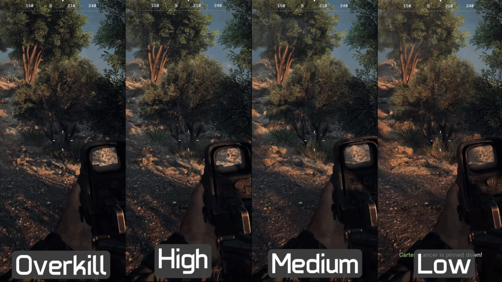ただ、実際の画質を見ると、最高画質設定である「Overkill」に対して「High」との差はかなり小さく、最低画質である「Low」に設定してもテクスチャーや影の品質が下がる以外に明確な画質差はないようです。