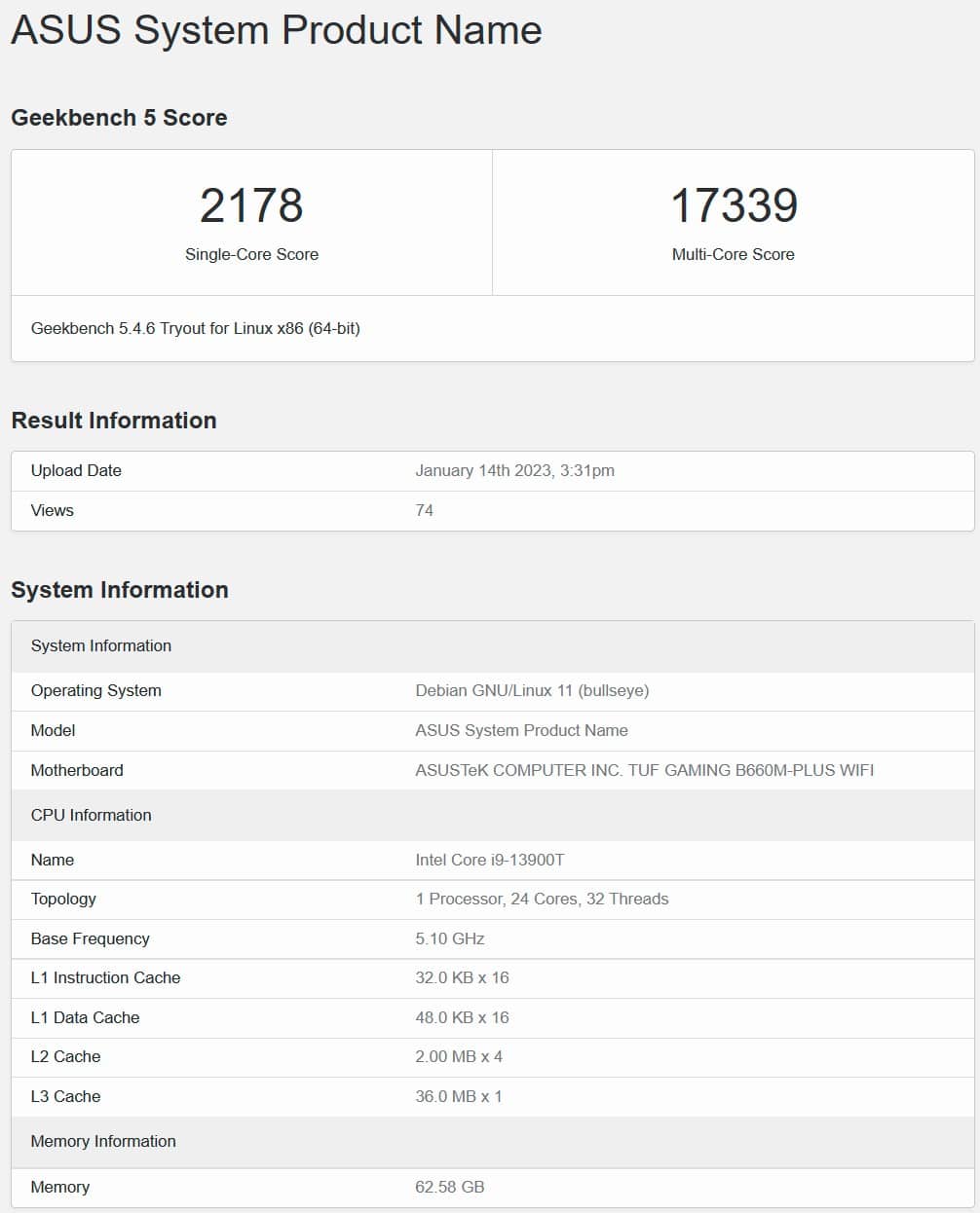 ベンチマークはASUSのTUF Gaming B660M-Plus WiFiに搭載された状態で行われており、メモリー容量は64GB、OSはLinuxを用いられています。