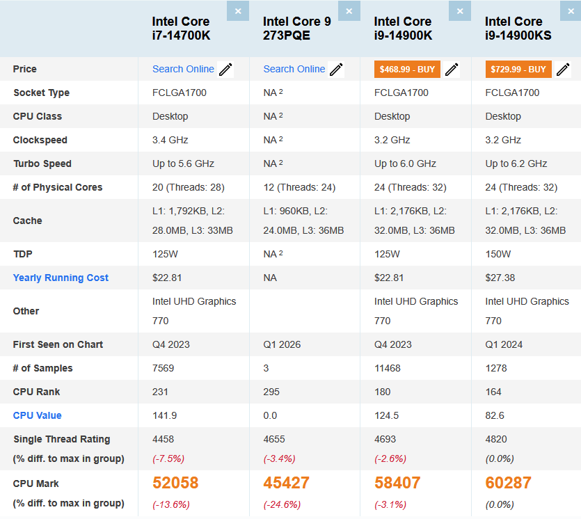 項目Core 9 273PQECore i9-14900KCore i7-14700K