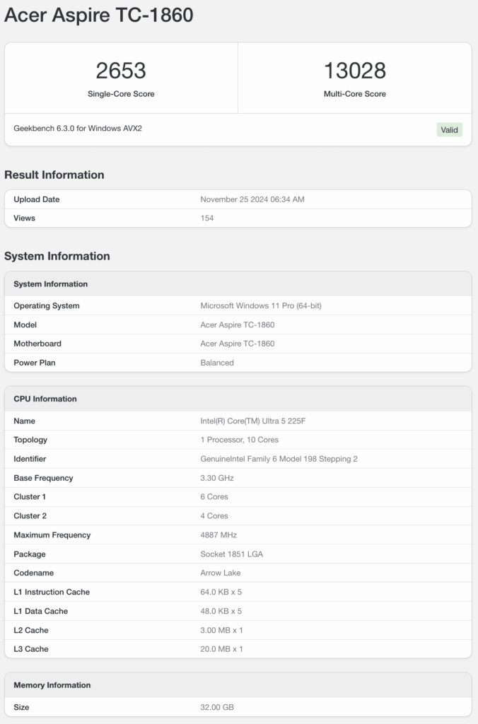 Acer Aspire TC-1860 (Core Ultra 5 225F) | Geekbench 6