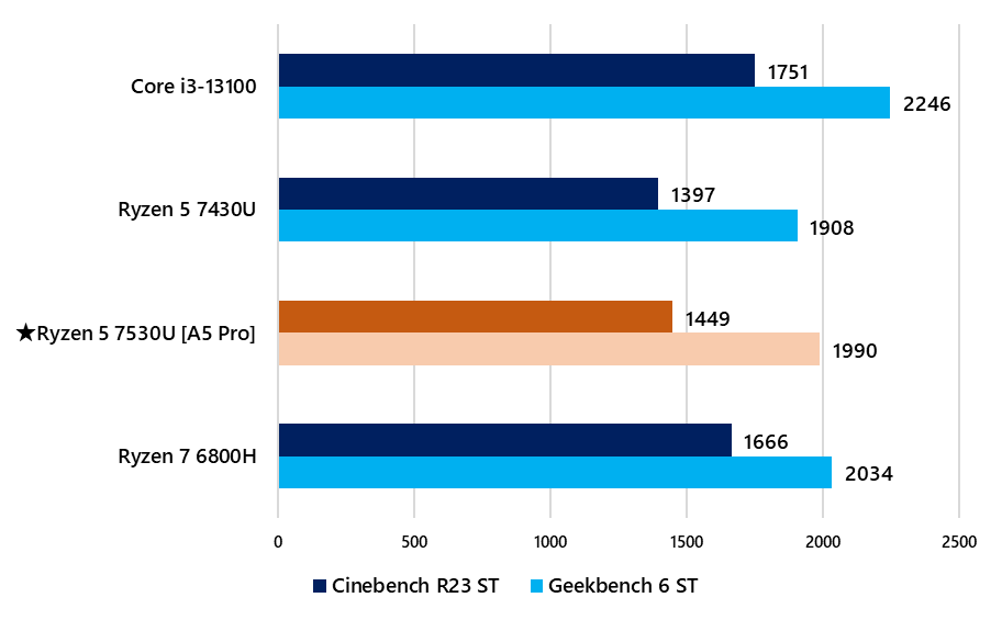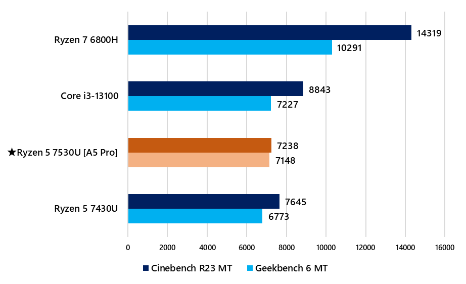 A5 Pro (2026) に内蔵されているCPUはAMD Ryzen 5 7530UでTDPは15Wで動作するノートPC向けCPUが搭載されています。CPUアーキテクチャーは2021年に投入されたZen 3アーキテクチャーを備えています。CPUの基本的なアーキテクチャーは5年前の製品となっていますが、ベンチマークの通りZen 3はまだまだ現役で使えるCPU性能を有しています。