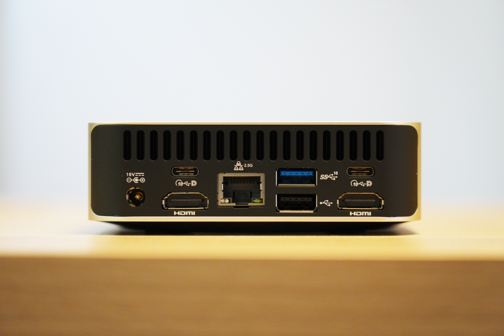 後面インターフェイスはUSB3.2 Gen 2 Type-CとUSB 3.2 Gen 2 Type-Aを2ポート、2.5Gbps対応イーサネットを1ポートに加え、HDMI 2.0は2口備えています。また、Type-CポートはAlt Modeに対応しているため、Display Portとしても機能するため、HDMI2口と合わせることで合計4画面出力が可能になっています。