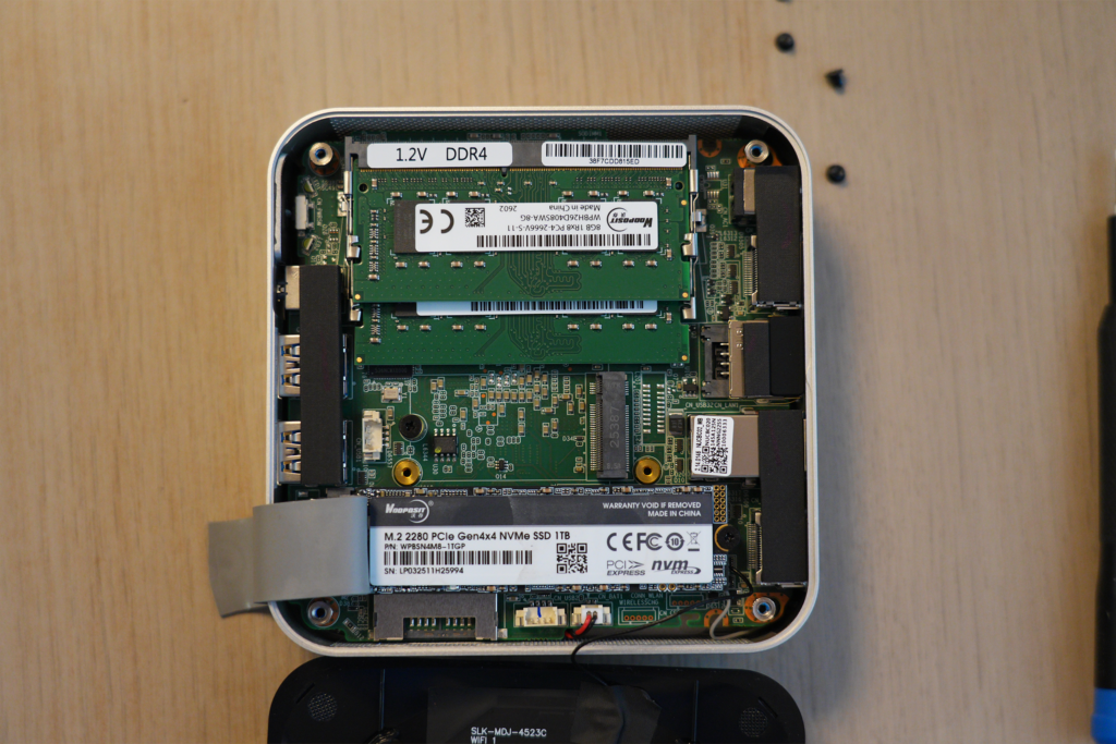 本体内部で交換可能な部品はM.2 2280サイズまで対応するSSD(SATAおよびNVMe対応)とM.2接続のWiFiモジュールに加え、DDR4 SO-DIMMがあります。また、M.2 2242サイズに対応するスロットが空いているため、NVMe SSDやM.2 SSDを追加することが出来ます。