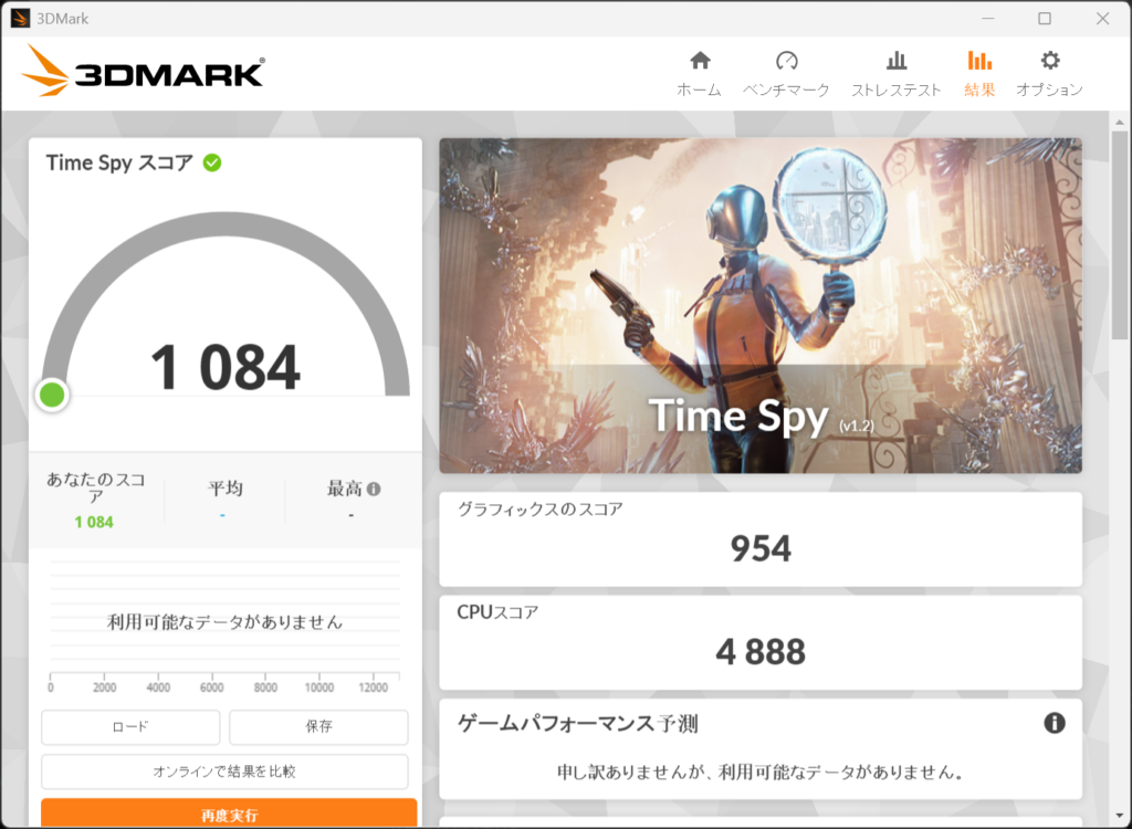 そのため、3DMark TimeSpyにおいてはGraphics Scoreが954ポイントを記録しており、3Dグラフィックを多用したゲームをプレイすることは難しいと言えます。