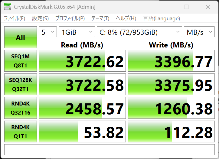 A5 ProではPCIe Gen 4 NVMe SSDを搭載しており、Crystal Disk Markによると読み込み性能は3700 MB/sほど、書き込み性能は3400 MB/sと高速なSSDを搭載しています。そのため、ファイルのローディングはもちろんのこと、ファイルの書き出しなどでも滞りなく作業することが出来ると言えます。