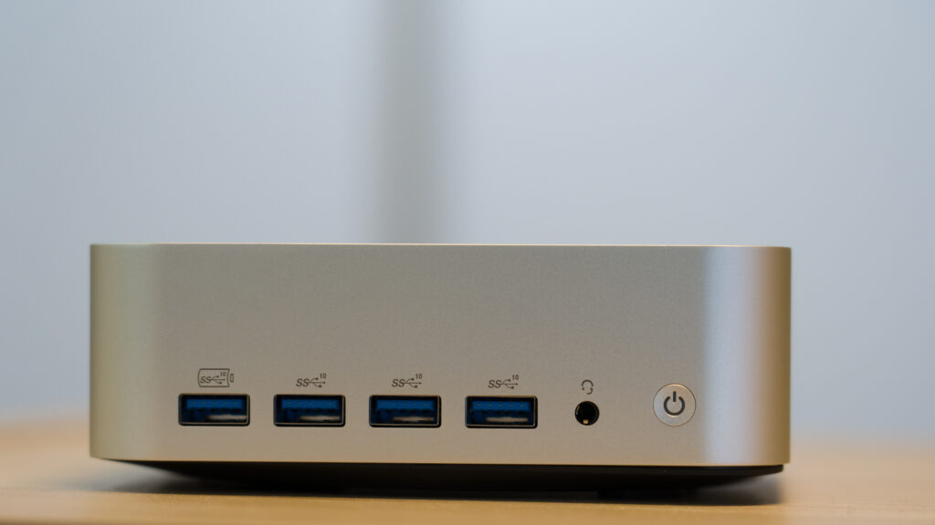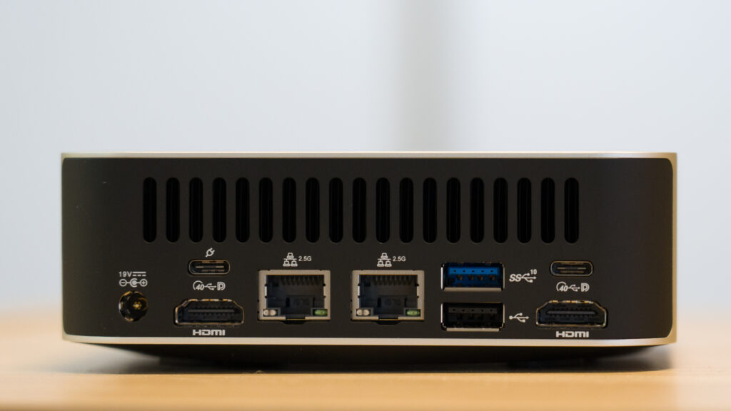 背面にはインターフェイス類がまとめられており、ACアダプター経由の電力供給に加え、USB-PD経由での電力供給やAlt-Mode対応のUSB4を2つ備えています。また、HDMI 2.0ポート、最大2.5Gbps対応のイーサネットを2つ搭載しています。さらにUSB3.2 Gen 2とUSB 2.0対応のType-Aポートをそれぞれ1つずつ搭載しています。