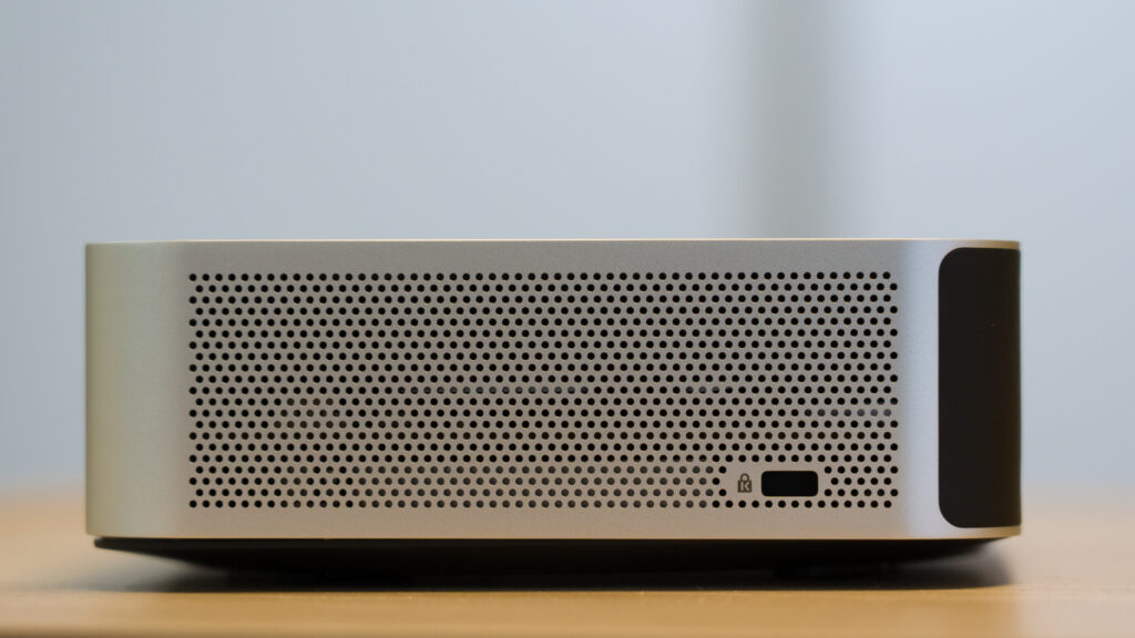 外観は正方形のデザインを採用しており、背面や底面を除くすべての面にサンドブラスト加工を施したアルミ素材を使用しています。これにより質感の高い仕上がりとなっています。