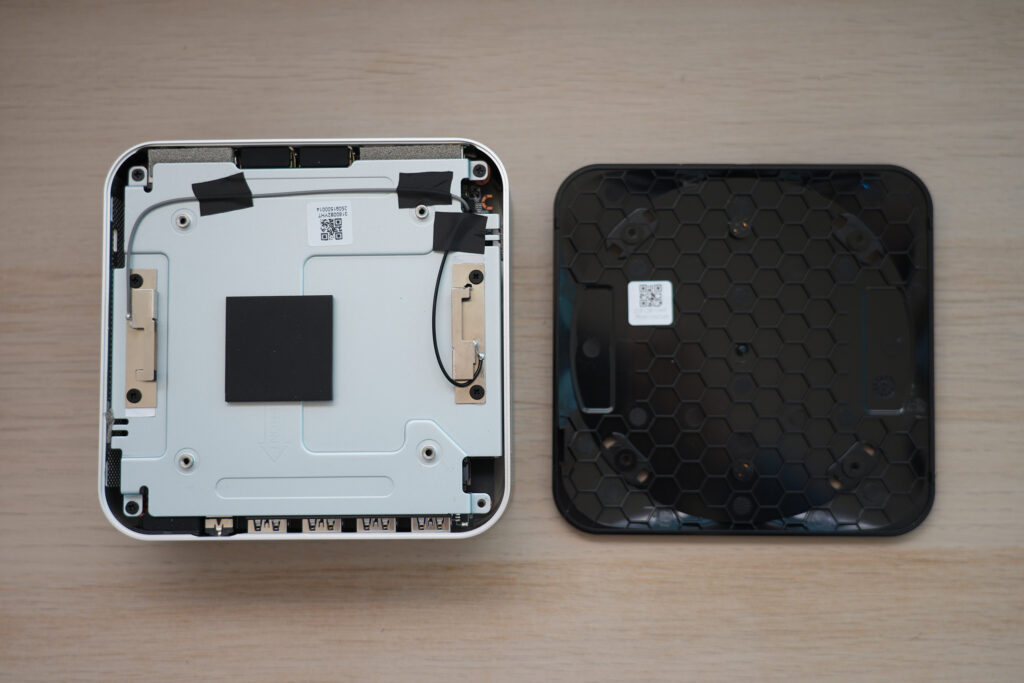 底面の蓋を開けると、Wi-Fiアンテナなどを備えたブラケットが内部を覆っています。このブラケットを取り外すことでSSDやメモリにアクセスできます。
