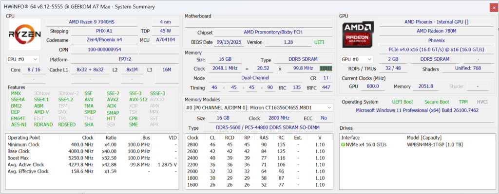 GEEKOM A7 MaxにはAMDのRyzen 9 7940HSを搭載しています。このAPUはCPU側にZen 4アーキテクチャのコアを8基搭載し、動作クロックはベースが4.0 GHz、ブースト時は最大5.2 GHzに設定されています。
