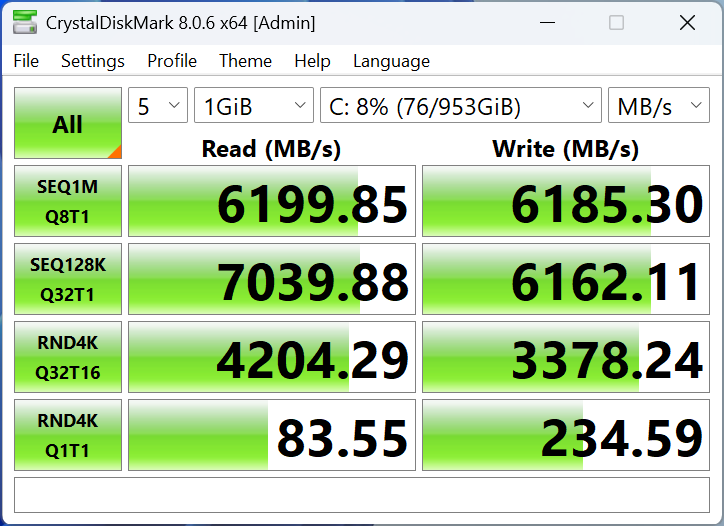 内蔵SSDはPCIe Gen 4対応のNVMe SSDです。CrystalDiskMarkによる計測では、読み取り性能が6,200 MB/s、書き込み性能が6,190 MB/sと、PCIe Gen 4の理論上限に近い優秀な性能を発揮しています。