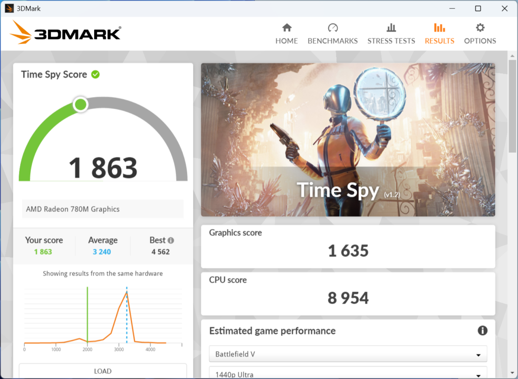 3DMark TimeSpyにおいてはGraphics Scoreが1635ポイントを記録しています。このスコアはRyzen 9 7940HSとしてはかなり低めで、RDNA 2搭載のRyzen 7 6800Hが記録する2460ポイントを下回っています。