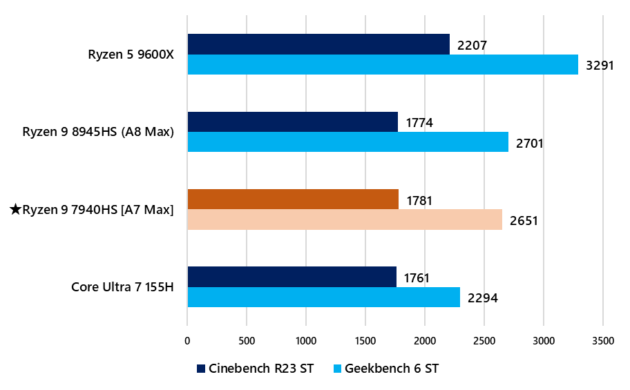 Cinebench R23とGeekbenchで計測した結果、GEEKOM A7 Maxに搭載されているRyzen 9 7940HSは、シングルコア性能において上位モデルA8 MaxのRyzen 8945HS並みの性能を発揮しています。