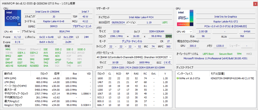 なお、2024年に紹介したGT13 ProではCore i9-13900Hを搭載しているのに対して、今回のGT13 Pro (2025)はCore i9-13900HKを搭載しています。この2つのCPUの違いはオーバークロックの可否のみで、標準で設定されている動作クロックなどは全く同じです。