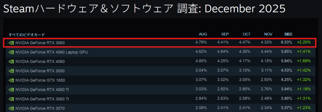 GeForce RTX 3060は現在でもユーザー数が多いグラフィックカードとなっており、2025年12月集計のSteamハードウェア調査でもシェア1位を獲得しています。また、ゲーミング性能についてもフレーム生成以外のDLSS 3機能は利用可能で、1080p解像度であればDLSSを有効にすれば最新タイトルでも50~60fps程度での動作を目指せる性能を備えています。