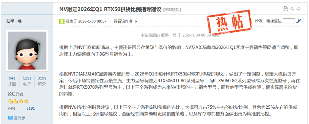 中国のハードウェアフォーラム「博板堂」に書き込まれたリークによると、NVIDIAは2月から始まる2026年第1四半期におけるGeForce RTX 5000シリーズの供給方針を確定させたとのこと。この情報はすでにAIBにも共有されたそうです。