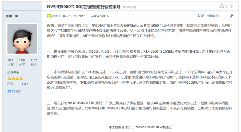 流通関係者によると、NVIDIAはAIBパートナーや販売代理店に対して、RTX 5060 Ti 8GBモデルの出荷量を抑えるよう要請しています。