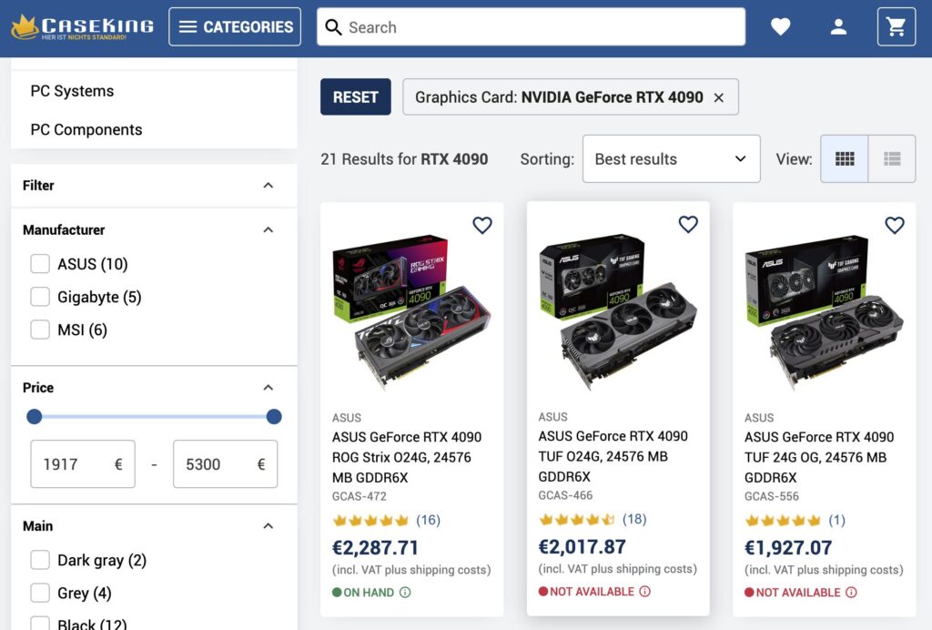 3DCenterがまとめた情報によりますと、ドイツでのRTX 4090の販売価格は今年4月までは€1750~1900のレンジで販売されていたとのことですが、9月終わりにかけて各店舗での平均価格が€1850~2000と5%の値上がりが見られている他、主要なオンラインショップでは在庫がほとんど残っておらず、MindFactoryでは在庫がなく、Casekingでも€2288で販売されているASUS ROG STRIXを残す以外、すべて在庫なしの状態になっているそうです。