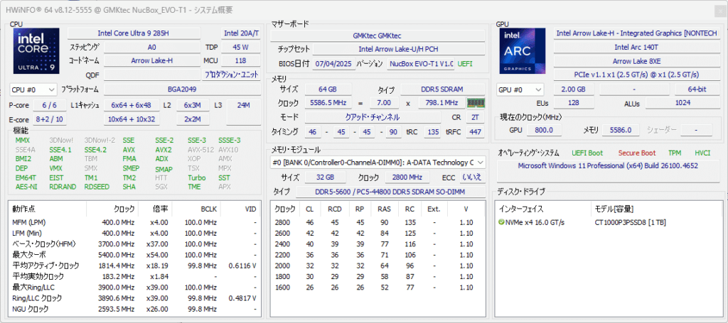 GMKTec EVO-T1に内蔵されているCPUはIntelのArrow Lake世代であるCore Ultra 9 285Hを搭載しています。このCPUはP-Coreを6コア、E-Coreを8コア、LPE-Coreを2コアの合計16コア備えたCPUになっています。