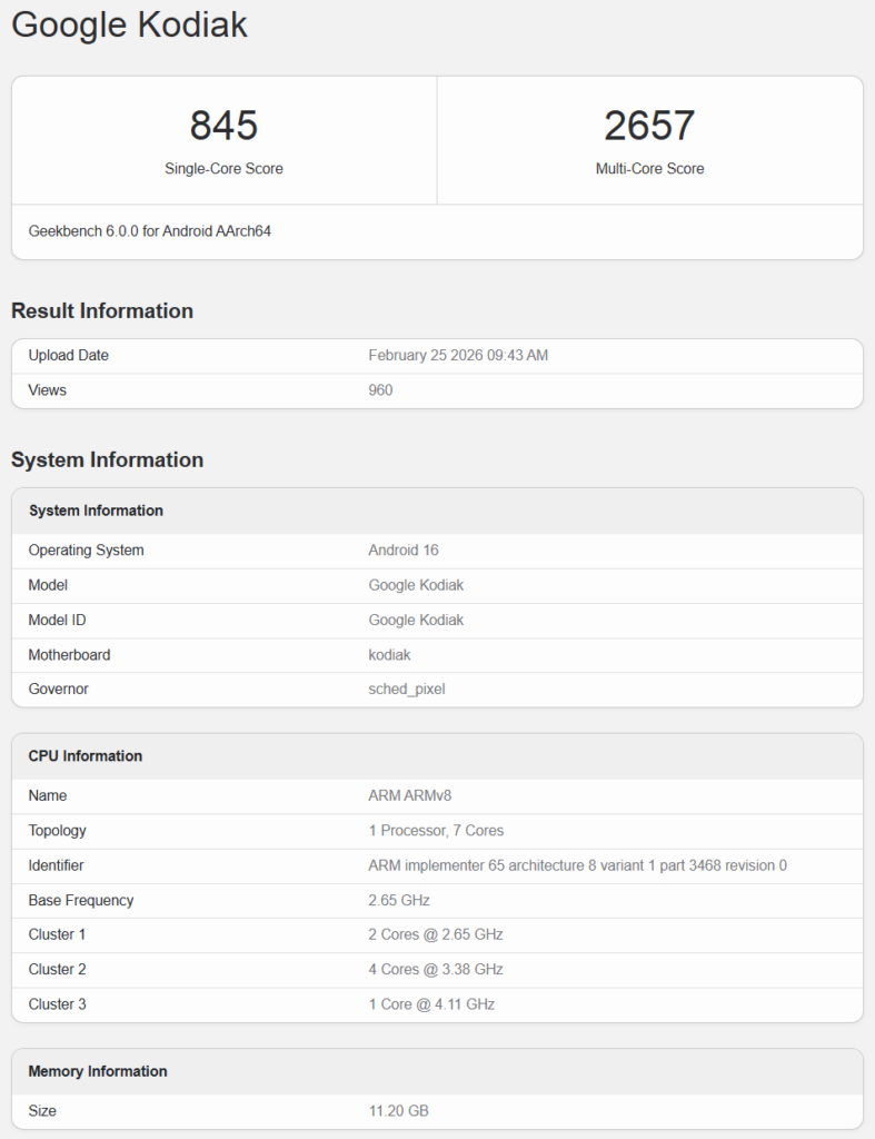 Geekbench 6のデータベースに登録されたのは「Google Kodiak」と言うデバイスで、これはPixel 11 Pro XLのコードネームであることから、搭載チップセットはTensor G6であると見られています。