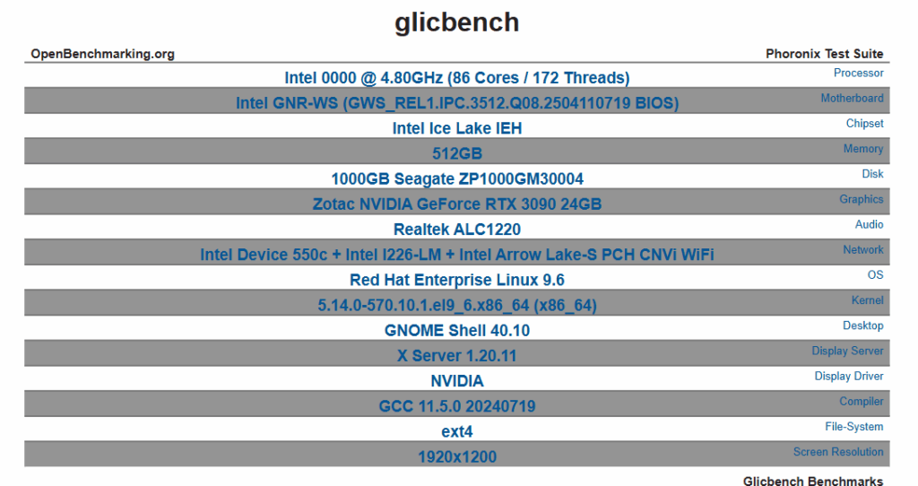 OpenBenchmarkingのデータベースにIntel GNR-WSと呼ばれる製品が登録されていることがmomomo_us氏によって発見され、これが製品の名称からGranite Rapids-WSであると見られています。同CPUはその中でも最上位モデルと見られており、コア数は86コア、スレッド数は172スレッドで構成されています。ただ、動作クロックはベンチマークのテスト環境には4.8 GHzとかなり高めに記載されていますが、ログ上では最大2.1 GHzとかなり低めで動いていることからエンジニアリングサンプル品を用いてベンチマークが行われています。
