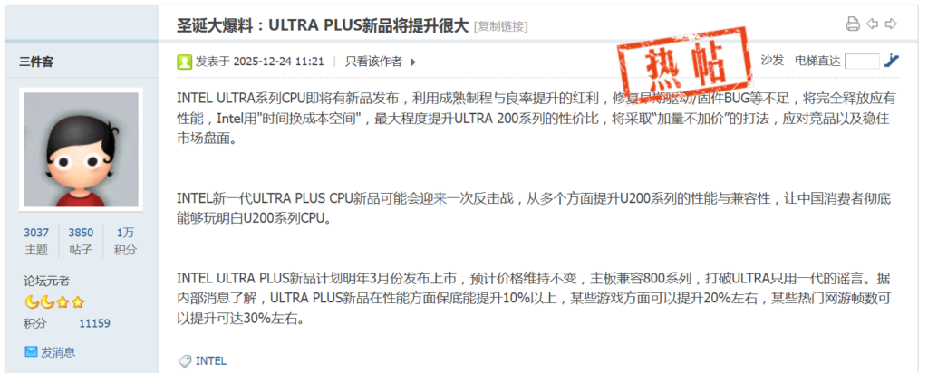中国の掲示板「博板堂」には、まもなく正式発表されるCore Ultra 200S Plusに関するリーク情報が書き込まれています。このリークによると、同CPUは初期のドライバーやファームウェアのバグなどの問題点を修正することで、本来あるべき性能に到達したとのことです。2024年に発売されたオリジナルのArrow Lakeに対して性能が向上するとされています。