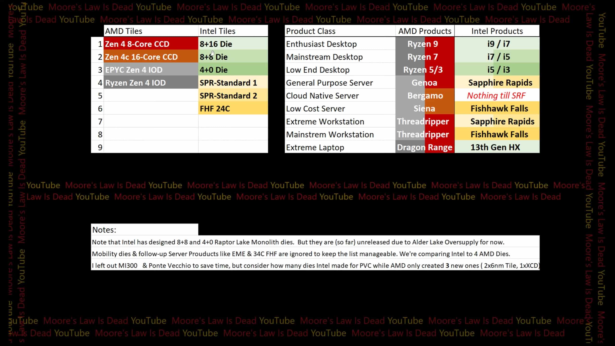 AMDとIntel各社が持つCPUダイについては大まかにまとめると、AMDがZen 4 8コアのCCDとZen 4cの16コアCCD、EPYC Zen 4用のIOダイ、Ryzen Zen 4用のIOダイの合計4つがあります。一方で、Intelではコンシューマー向けに8P+16Eダイ、8P+8Eダイ、4P+0Eの合計3つ、サーバー向けではSaphire Rapids用に2種類、ワークステーション向けに24コアダイが1種類と6種類存在します。