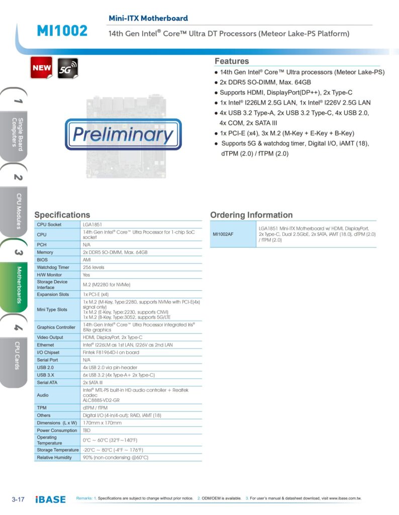 カタログに掲載されているMI1002と呼ばれるMini-ITXマザーボードにはCPUソケットにはLGA1851が搭載され、対応CPUには第14世代 Intel Core Ultra (Meteor Lake-PS)と記載されています。末尾にPSが付くモデルは主にIoT機器向けに変更した製品で、現在発売されているAlder Lake-PSではコンシューマー向けに販売されているAlder Lake-SやAlder Lake-Hなどをベースにしています。