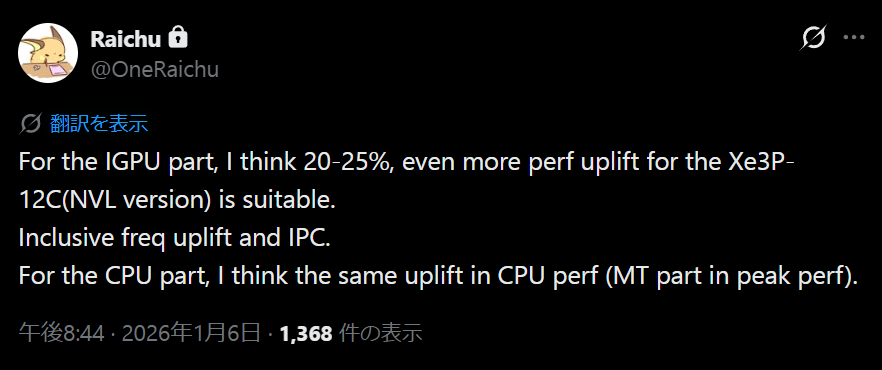 Intel関連のリーク情報で高い信頼性を持つOneRaichu氏によると、Nova Lakeに搭載されるXe3P GPUは、Panther Lake上位モデルに搭載される同じ12コアGPU構成と比較した場合、動作クロックの向上やIPC改善により20〜25%程度の性能向上が見込まれるとのことです。