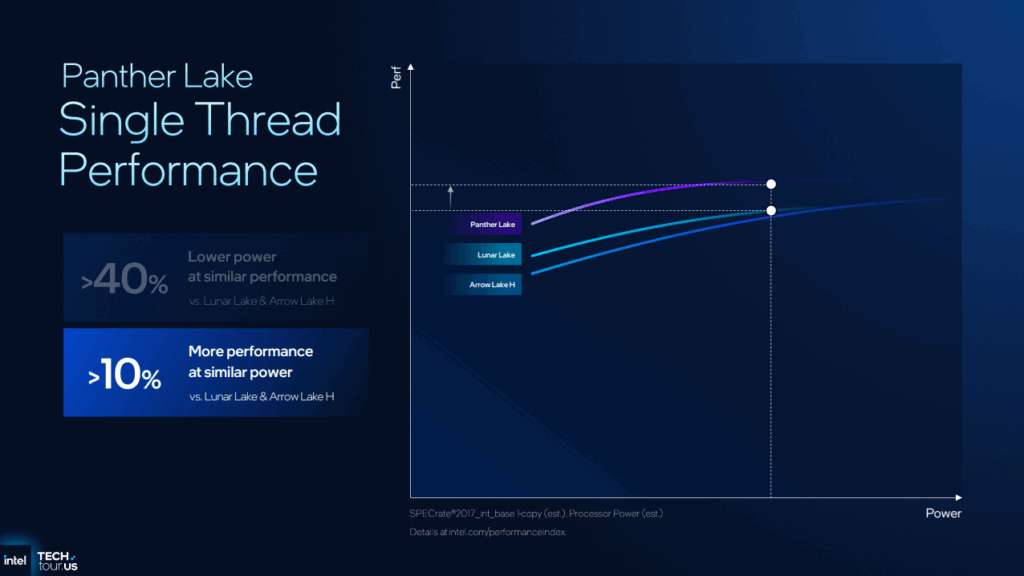マルチスレッド性能では、Panther LakeはLunar Lakeと同等の電力で50%高い性能を実現できるほか、Arrow Lake-Hと同等の性能を30%低い電力で達成できるとIntelは主張しています。